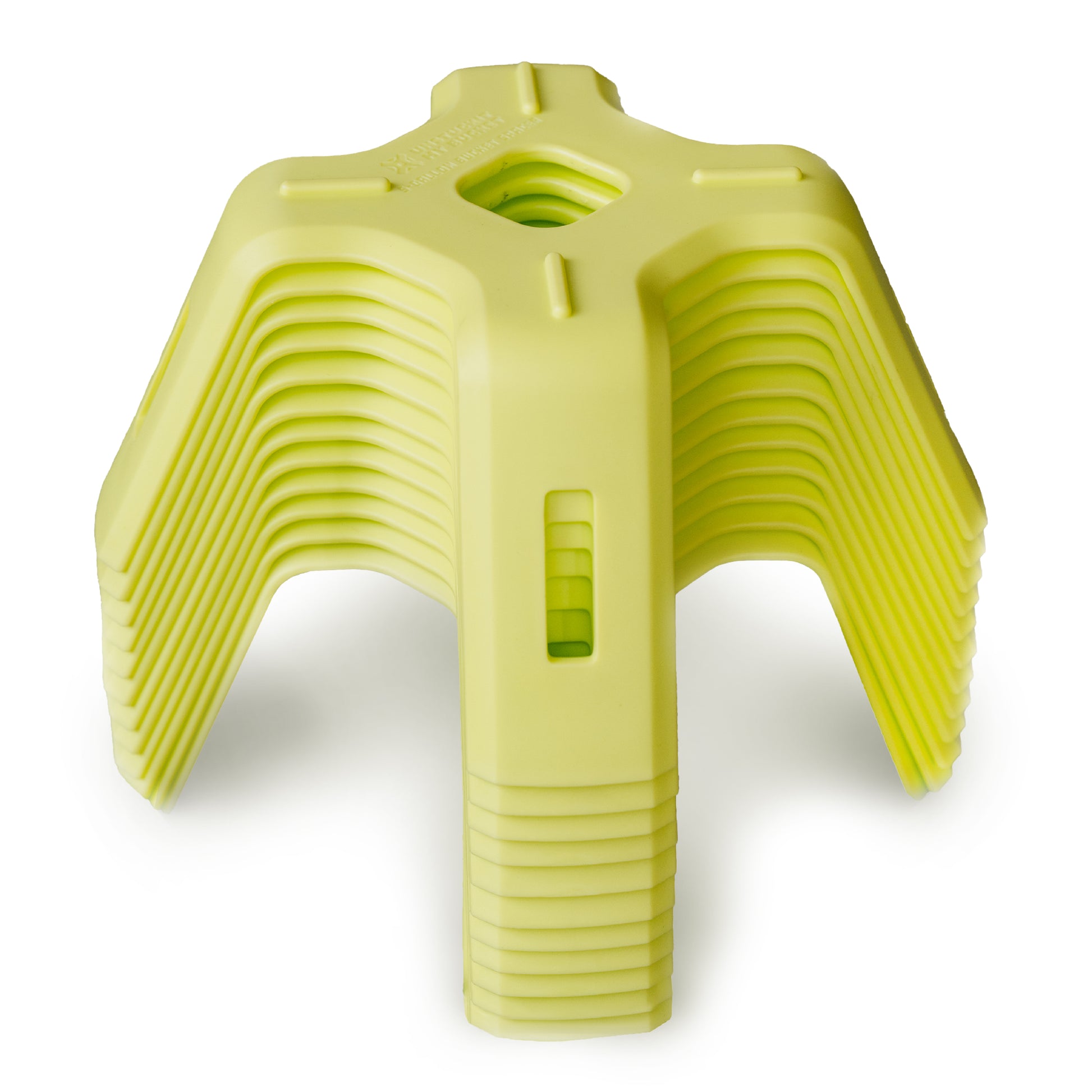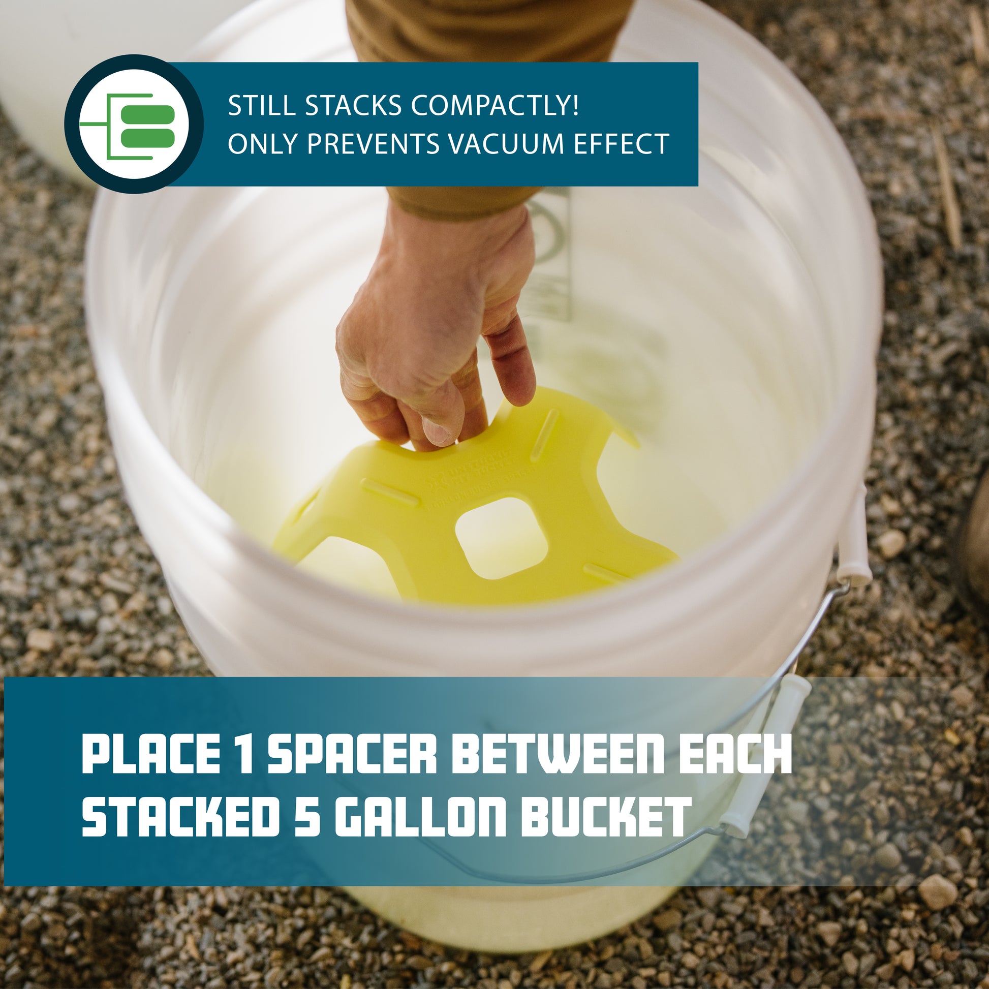 The 5-gallon bucket spacer was designed to precisely fit inside a 5-gallon bucket to space the buckets apart while they are being stored. Measuring at 10.25” wide x 4.5” tall the spacer provides a gap space of about 1” – 1.5” (in most standard 5-gallon buckets) of space between each bucket to prevent the vacuum seal that causes the buckets to become stuck together and still stack compactly. The spacer is lightweight, durable, made of HDPE plastic, and user friendly. When they are not in use, the spacers will comfortably stack together, one on top of another. Designed in the USA and complies with California Prop 65.